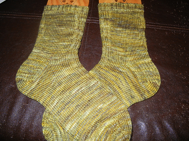 Woohoo! I love these! It's my own design based off of what I learned from the previous socks. Toe up, add a small gusset for the high arch, short row heel and a longer cuff. I'm gonna use this formula for my next plain-jane socks.